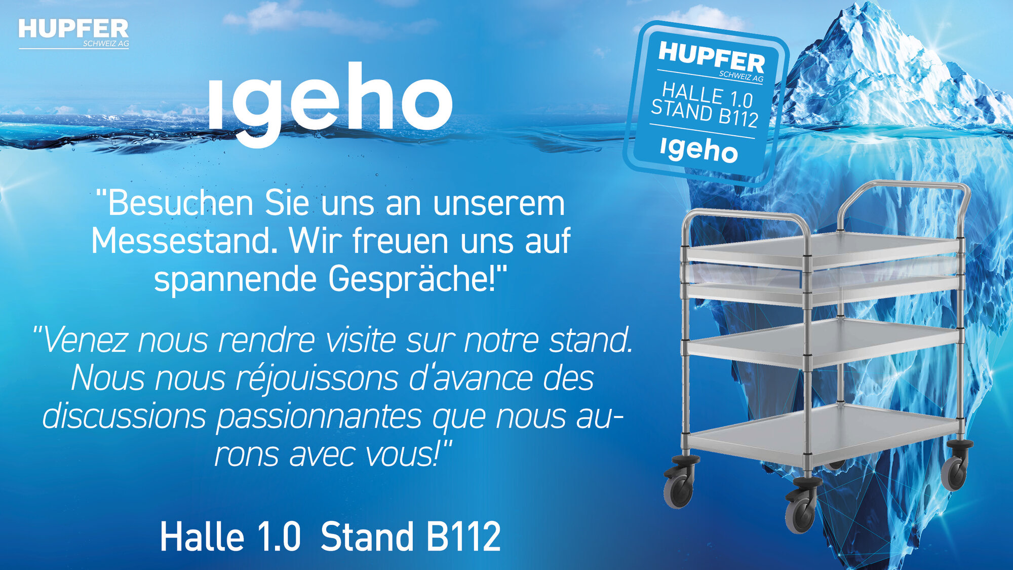 Wir von Hupfer Schweiz AG sind natürlich mit dabei und freuen uns darauf, euch live zu treffen. Entdecken Sie unsere neuesten Lösungen rund um die professionelle Küchenlogistik, der Lagerung bis zur Speiseverteilung und Ausgabe. Tauscht euch mit unserem Team aus und holt euch frische Ideen für euren Alltag.